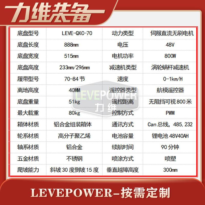 LEVE-QXC-70特種橡膠履帶底盤采用天橡膠內加凱夫拉纖維經過高溫硫化擠壓成型,材質輕、耐磨性能強,是一款不錯機器人橡膠履帶。
