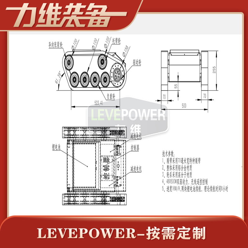 LEVE-XXW-70特種橡膠履帶底盤采用天橡膠內加凱夫拉纖維經過高溫硫化擠壓成型,材質輕、耐磨性能強,是一款不錯機器人橡膠履帶