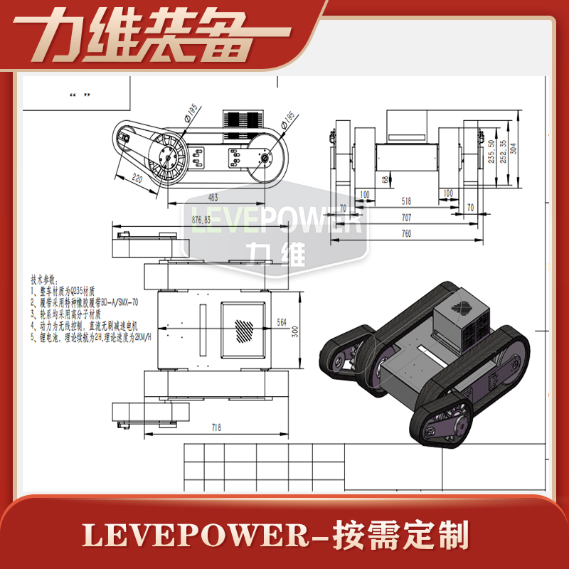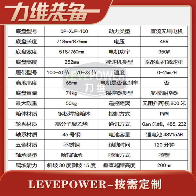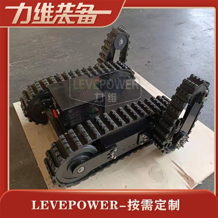 此款微型擺臂底盤主履帶采用寬度100mm特種橡膠履帶,擺臂履帶采用寬度70mm機器人履帶,內置高強纖維,是一款抗拉強度高,耐磨性能好的機器人橡膠履帶。支架采用鋼板焊接焊接而成,車體表面做噴塑處理。輪系采用高分子聚乙烯材質,重量輕,密度高,和履帶磨合性搭配。采用直流無刷電機,渦輪蝸桿減速機配合使用,履帶底盤電池采用磷酸鐵鋰鋰電池,體積小,續(xù)航時間長,履帶車輛前置履帶擺臂,擺臂可上下擺動,前后行走運動,體積小巧靈活,此款擺臂機器人可載重50kg,底盤上可裝置攝像頭,機械臂等物品,用于狹小環(huán)境內偵察等工作使用。