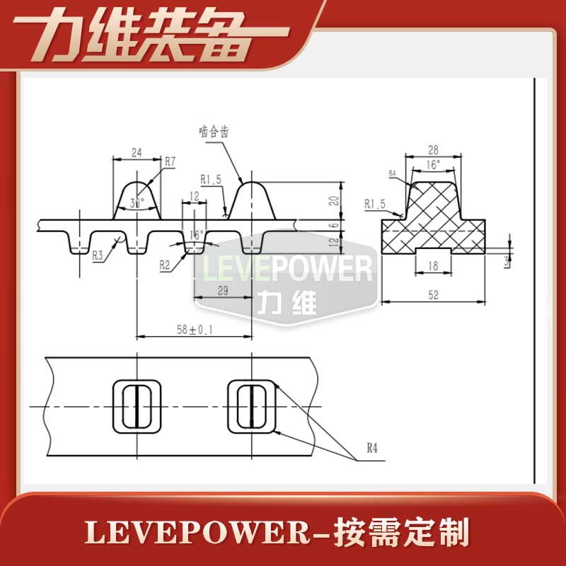此履帶為撥齒履帶,外花紋采用矩形橫紋設(shè)計(jì),內(nèi)齒采用節(jié)距適中的三角塊狀設(shè)計(jì),帶體較厚,此款設(shè)計(jì)提高了履帶自身的載重能力,和抓地力是一款適合用于機(jī)器人底盤的配套履帶。