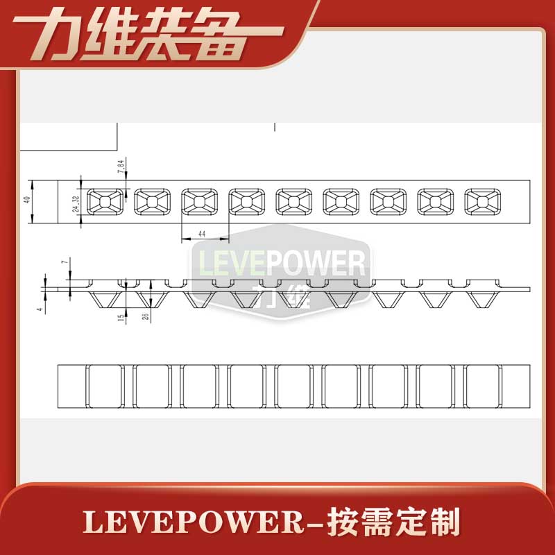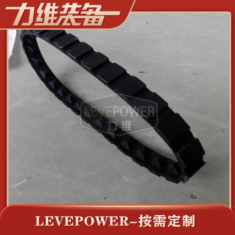此履帶為撥齒履帶,外花紋采用方塊矮齒緊密設(shè)計(jì),內(nèi)齒采用節(jié)距適中的三角塊狀設(shè)計(jì),帶體較厚,此款設(shè)計(jì)提高了履帶自身的載重能力,實(shí)現(xiàn)了在路面行駛非常平穩(wěn)功能。