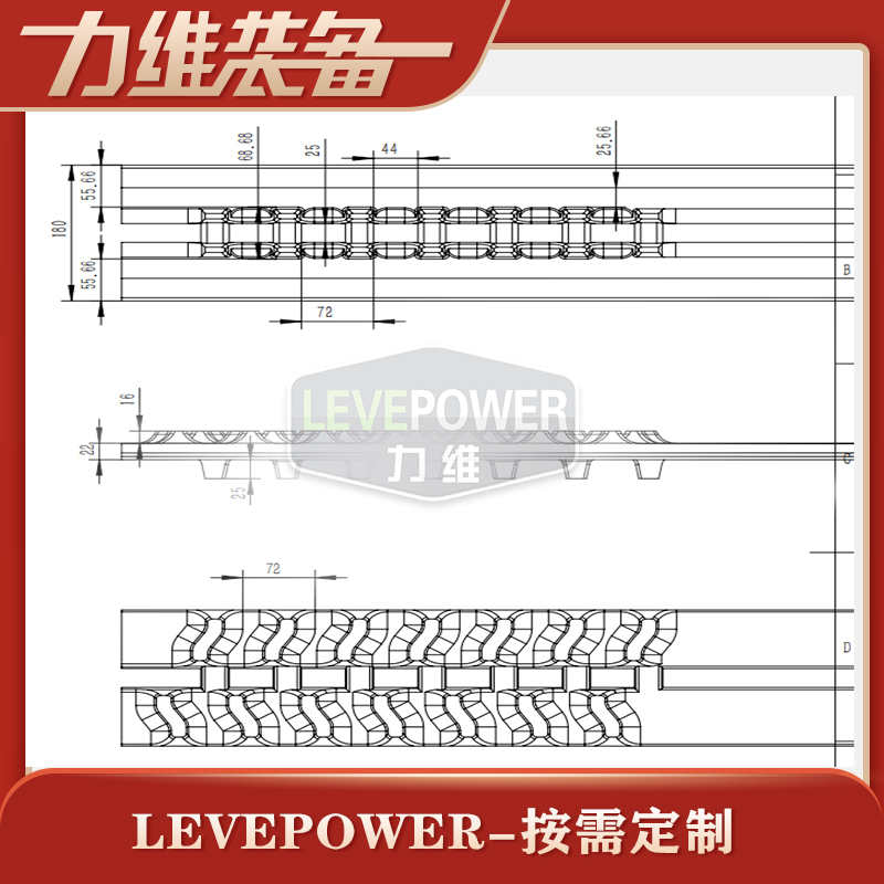 履帶內(nèi)齒采用高齒梯形設(shè)計(jì),內(nèi)置鑄鋼件,外花紋采用塊狀對(duì)稱花紋,此設(shè)計(jì)大大提高了此款履帶的抓地力,轉(zhuǎn)彎的時(shí)候大大減小了脫帶機(jī)率。此款特種橡膠履帶帶體較厚,載重力較強(qiáng)。