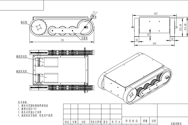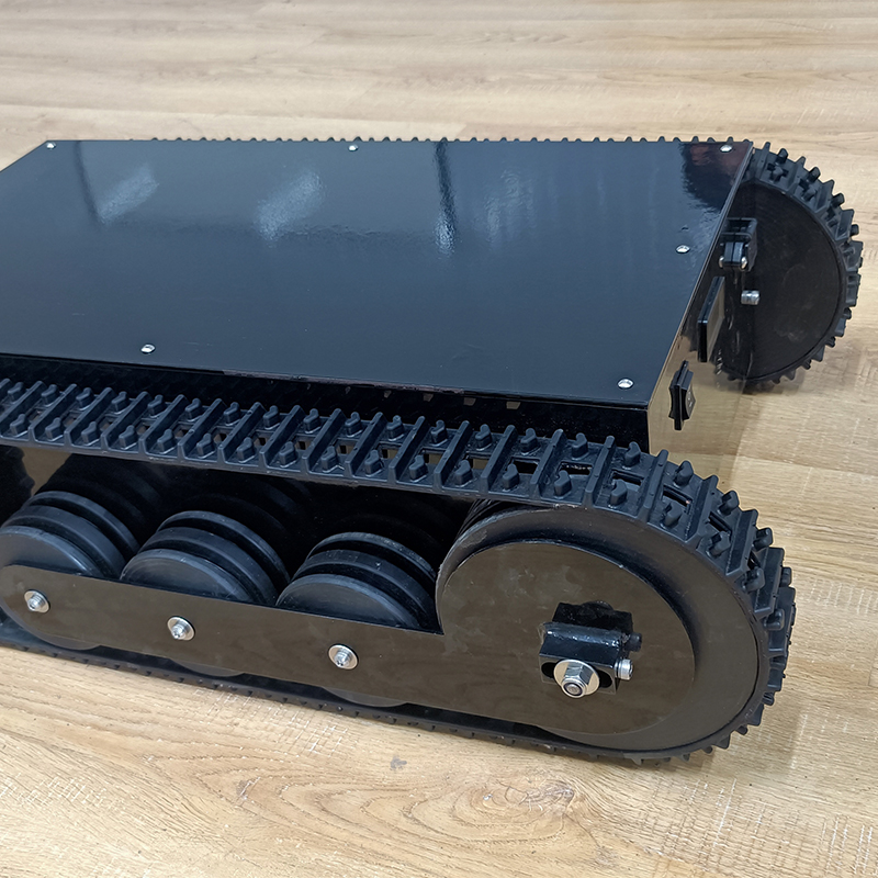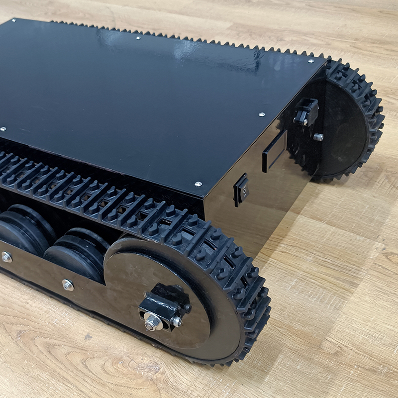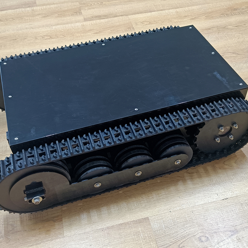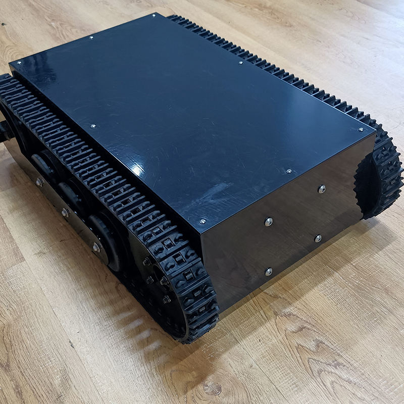 橡膠履帶底盤長(zhǎng)706mm,橡膠履帶底盤寬483mm,橡膠履帶底盤高215mm,無(wú)線航模遙控履帶底盤采用48v350W直流無(wú)刷永磁電機(jī),渦輪蝸桿減速機(jī)動(dòng)力更強(qiáng),轉(zhuǎn)彎靈活,操控簡(jiǎn)單。履帶底盤電池采用48V30AH鋰電池續(xù)航時(shí)間更長(zhǎng)。履帶底盤箱體采用鋼板焊接而成,輪系采用高分子聚乙烯,履帶底盤整體重量輕,耐磨性強(qiáng)。