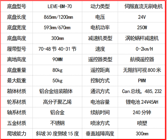 此款底盤為一款機(jī)器人履帶底盤,結(jié)構(gòu)箱體整體采用鋁合金板材拼接而成,帶兩個擺臂為了在爬樓梯或者攀爬其他障礙物的情況下更平穩(wěn)的通過。整體重量在80kg左右,輕巧,靈活,行駛速度2km每小時。